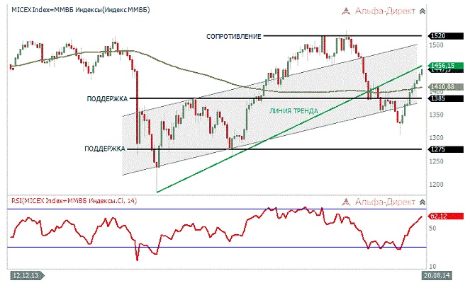 Что касается российского рынка, то индекс ММВБ достиг того уровня, где ранее открытые «лонги» лучше всего зафиксировать. Особо агрессивные спекулянты могут пойти дальше и открыть «шорт». В ближайшее время мы рассчитываем увидеть  движение в район горизонтальной «поддержки» (1385 пункта) после чего рост, как нам кажется, продолжится (см. иллюстрацию).